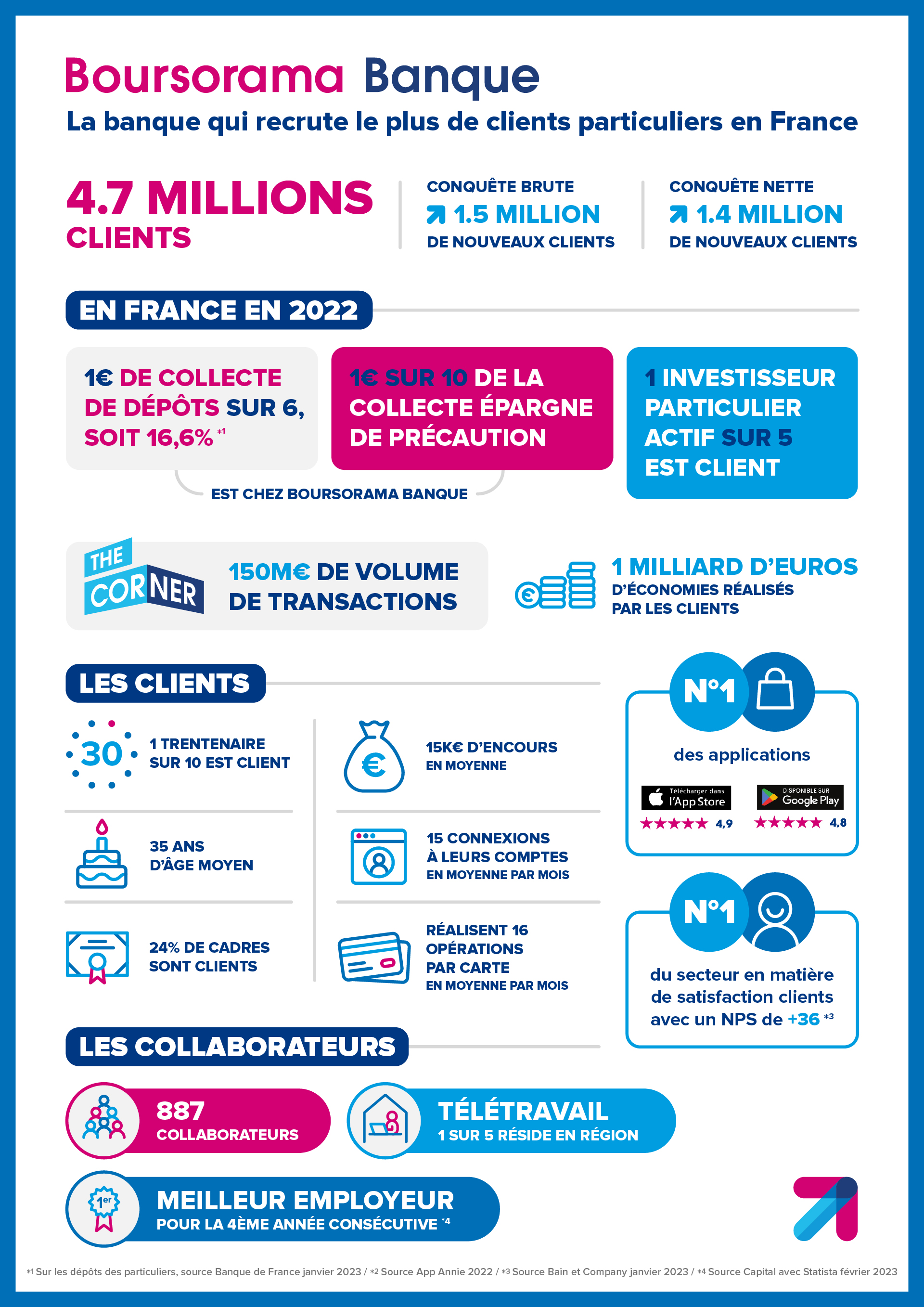 Avec une conquête de clients record de 1,5 million en brut et 1,4 million en net, Boursorama Banque est la banque qui a recruté le plus de clients particuliers en France en 2022. Le leader de la banque en ligne compte désormais 4,7 millions de clients. Une conquête historique qui confirme la pertinence de son modèle et de ses produits.