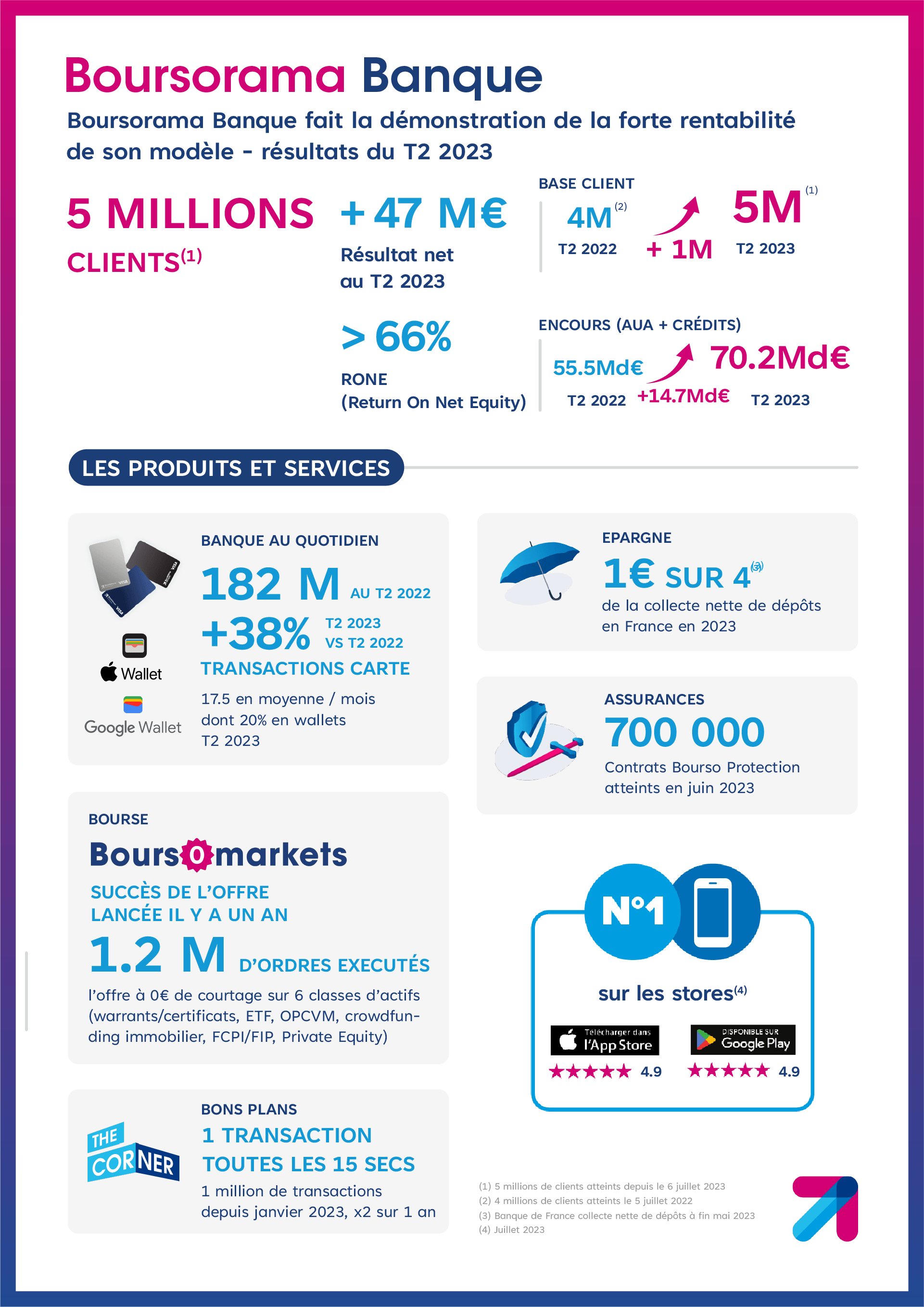 Après avoir démontré ces dernières années son attractivité et sa capacité industrielle à acquérir et engager ses clients, Boursorama Banque dévoile aujourd’hui son très haut niveau de rentabilité atteint sur un rythme d’acquisition piloté. Au deuxième trimestre 2023, Boursorama Banque compte 5 millions de clients1, réalise un résultat net de 47M€ pour un RONE (Return On Net Equity) de 66 %.