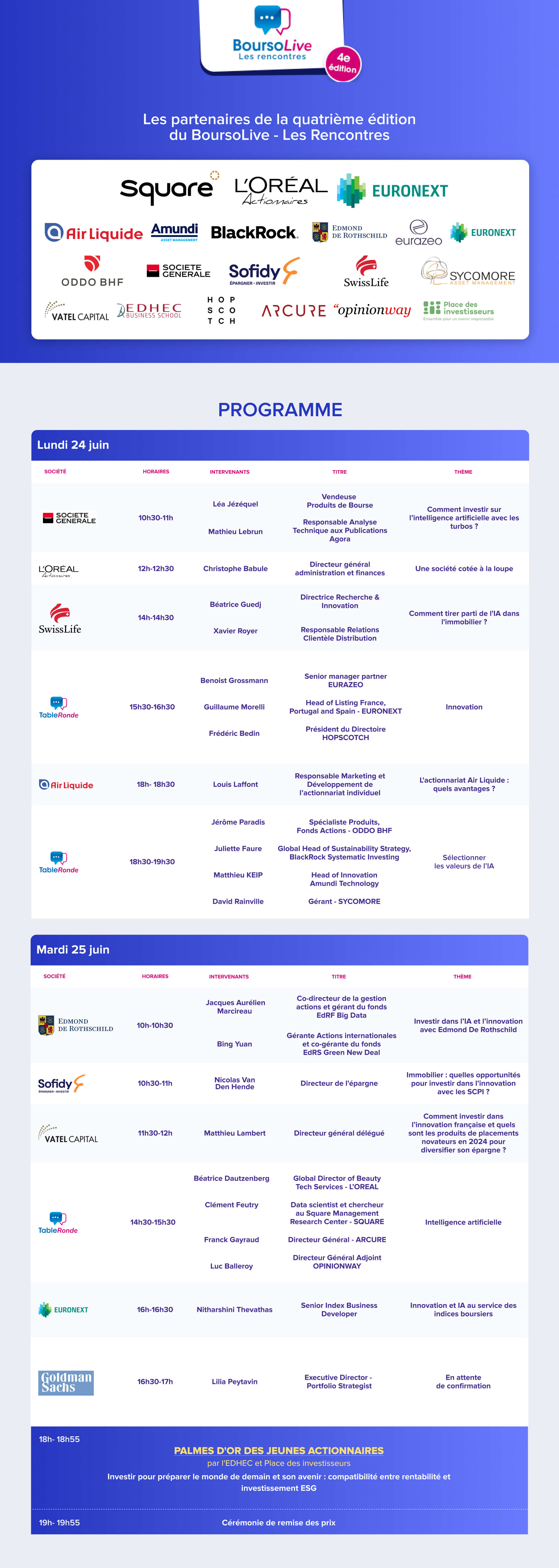 Lundi 24 et mardi 25 juin, chef d’entreprises, experts et professionnels de marchés débattront lors de tables rondes et de conférences interactives afin d’apporter des réponses concrètes et des solutions d’investissement aux particuliers, novices ou experts, désireux de comprendre l’impact et les conséquences de la révolution IA.