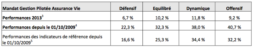 Les performances enregistrées en 2013 par l’offre de Gestion Pilotée sur le contrat Boursorama Vie confirment les excellents taux de rendement obtenus sur les quatre mandats(2) et ce depuis la création de l’offre, le 1er octobre 2009.