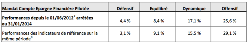 Lancé en juin 2012, le Compte d’Epargne Financière Pilotée est un compte-titres qui offre une solution d’épargne complémentaire. Les fonds sont disponibles à tout moment et la gestion du compte est similaire à celle d’un livret d’épargne classique. Depuis sa création, le CEFP a enregistré de bonnes performances sur les quatre mandats(6) proposés.